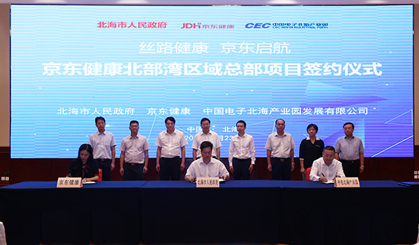 2019年9月23日,京東健康北部灣區(qū)域總部項(xiàng)目簽約儀式在北海香格里拉大酒店舉行。市長蔡錦軍,京東集團(tuán)副總裁、京東健康首席執(zhí)行官辛利軍,中電北海產(chǎn)業(yè)園發(fā)展有限公司執(zhí)行董事徐俊男等見證簽約儀式。